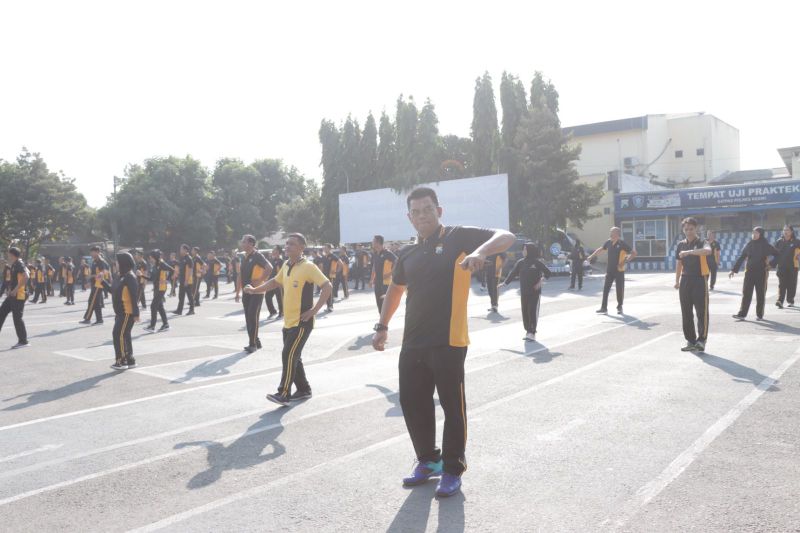 Senam bersama diikuti oleh seluruh anggota Polres Kediri, baik Polri maupun ASN, di lapangan belakang Mapolres Kediri.