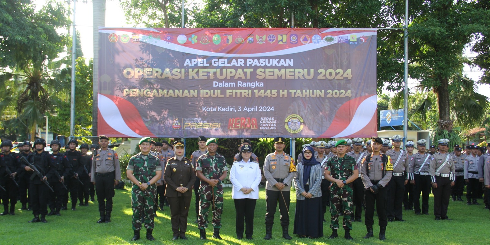 KEDIRI KOTA (DN) – Polres Kediri Kota menggelar upacara Apel Gelar Pasukan Operasi Ketupat Semeru 2024 di Halaman Pemkot Kota Kediri, Rabu (3/4/24)