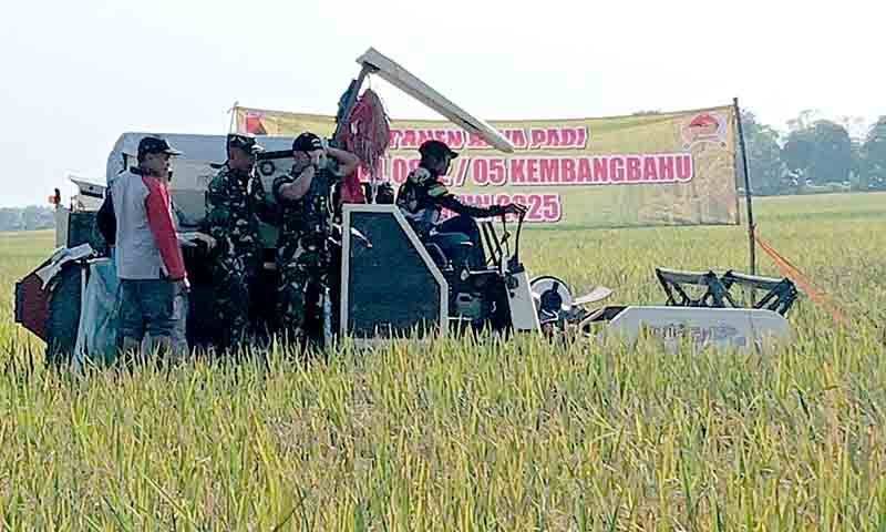 LAMONGAN – DN | Upaya mendukung swasembada pangan terus digencarkan di berbagai daerah, termasuk Kabupaten Lamongan. Salah satu wujud nyata komitmen tersebut diperlihatkan oleh Koramil 0812/05 Kembangbahu, yang turut mendampingi proses panen padi varietas PMJ 01 di Dusun Dongglonggong, Desa Sidomukti, Kecamatan Kembangbahu, Kamis (10/7/2025).
