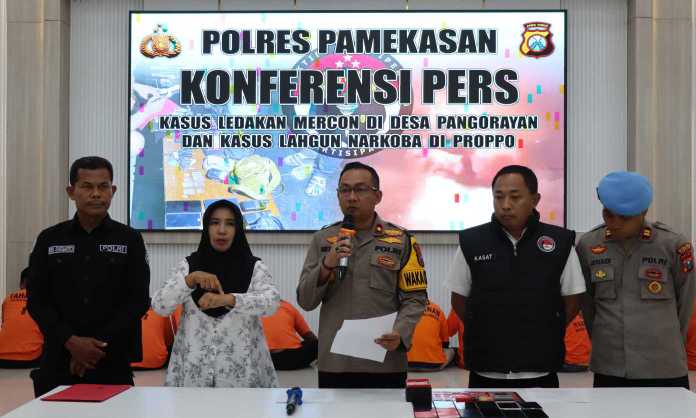 Wakapolres Pamekasan Kompol Hendry Soelistiawan saat konferensi pers di Gedung Tatag Trawang Tungga, mengatakan dari hasil penggeledahan, petugas berhasil mengamankan 3 (tiga) tersangka penyalahgunaan narkoba jenis sabu.