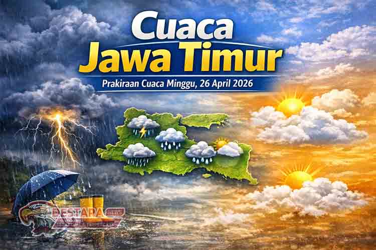 SURABAYA | MDN – Badan Meteorologi, Klimatologi, dan Geofisika (BMKG) memprediksi cuaca di wilayah Jawa Timur pada Minggu, 26 April 2026, akan didominasi kondisi berawan dan hujan ringan di sejumlah daerah. Warga diimbau tetap waspada terhadap perubahan cuaca yang cepat di masa pancaroba ini.