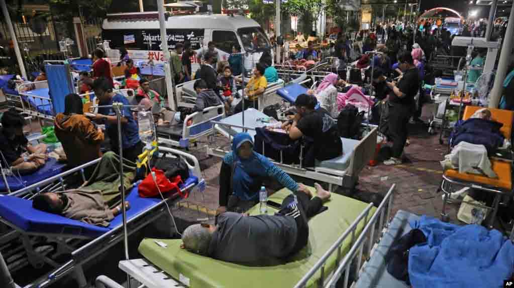 Sejumlah pasien dirawat di luar sebuah rumah sakit menyusul gempa bumi di Surabaya, Jawa Timur, Jumat, 22 Maret 2024. (Foto: Tristadi/AP Photo)