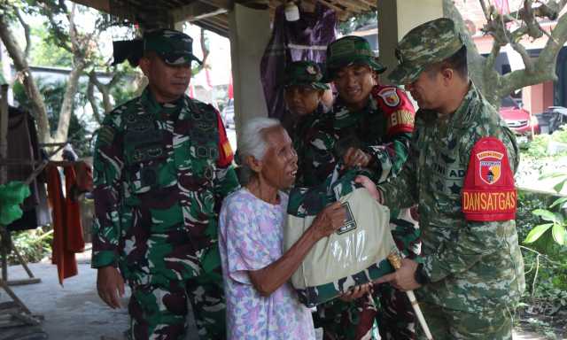 KEDIRI | DN – Komandan Satuan Tugas (Dansatgas) TNI Manunggal Membangun Desa (TMMD) ke-127 menyerahkan paket sembako kepada warga penerima program rumah tidak layak huni (rutilahu) di Desa Gadungan, Kecamatan Puncu, Kabupaten Kediri.