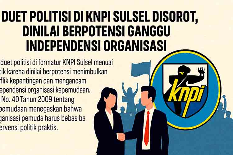 MAKASSAR – DN | Rencana masuknya dua politisi muda, Vonny Amelia (Gerindra) dan Bung Aso (PAN), dalam struktur formatur Komite Nasional Pemuda Indonesia (KNPI) Sulawesi Selatan menimbulkan perdebatan hangat. Sejumlah pemerhati kepemudaan menilai wacana tersebut berpotensi menyeret KNPI ke dalam kepentingan politik praktis, sehingga mengikis independensi organisasi yang seharusnya menjadi wadah netral bagi pemuda.