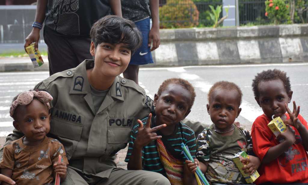MIMIKA | DN – Pada sela-sela pelaksanaan tugas operasinya di Papua, personel Operasi Damai Cartenz yang bertugas di Kabupaten Mimika, Papua Tengah menyempatkan diri mengitari jalanan kota Mimika berbekal sejumlah kotak susu untuk dibagikan kepada anak-anak yang dijumpai sedang beraktivitas atau bermain di sore hari pada Selasa, (28/1) bertempat di ruas jalan Cenderawasih, SP2 dan SP3, Kabupaten Mimika, Papua Tengah.