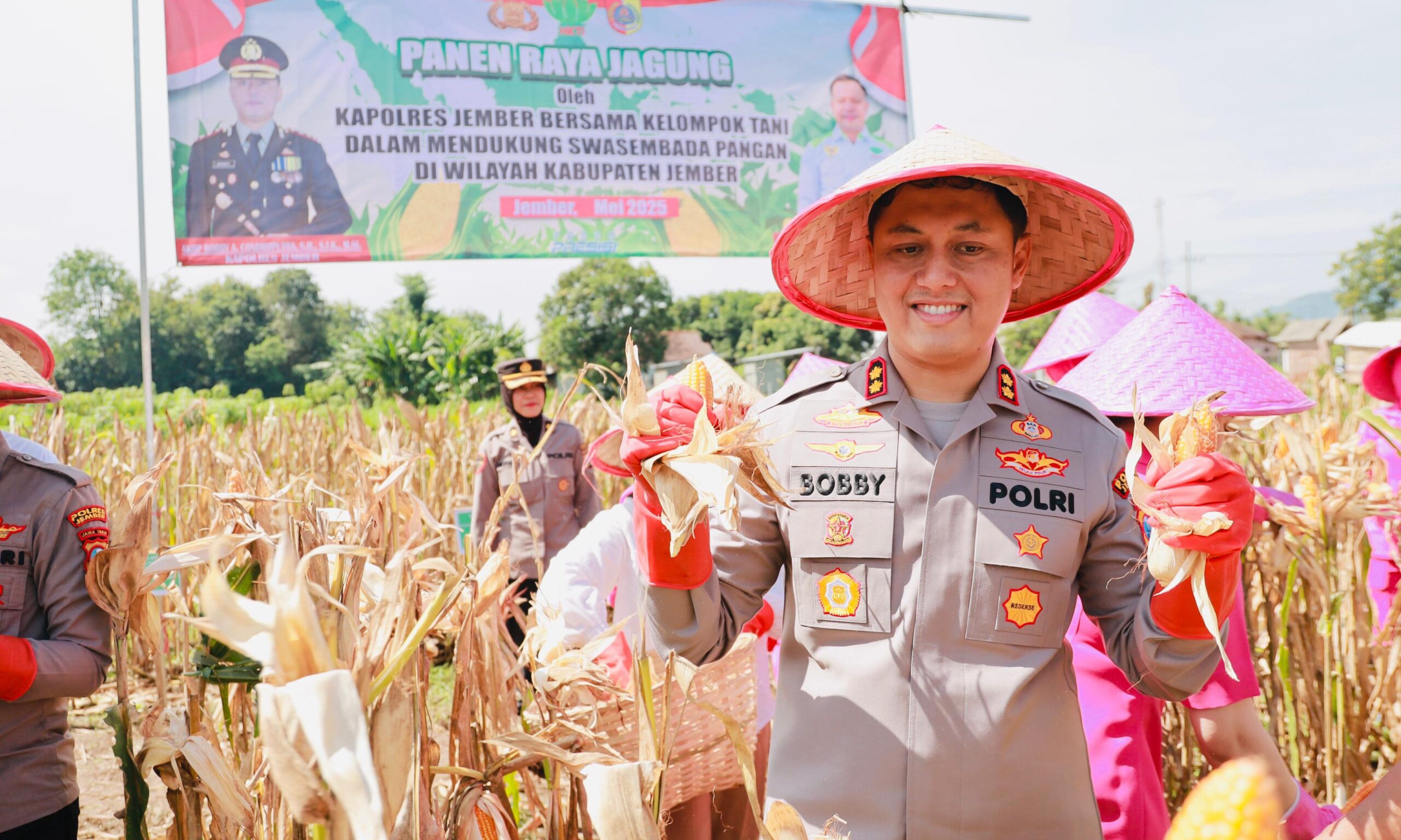 Hari itu, Kapolres Jember AKBP Bobby Adhimas Condro Putra turun langsung ke sawah untuk ikut panen raya jagung sekaligus menanam benih jagung baru bersama warga dan para pejabat terkait.