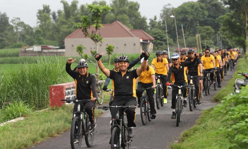 Kapolres Kediri AKBP Bramastyo Priaji, S.H., S.I.K., M.Si., bersama jajaran personel Polres Kediri mengikuti kegiatan olahraga gowes dengan rute datar (flat) mengelilingi kawasan tersebut.