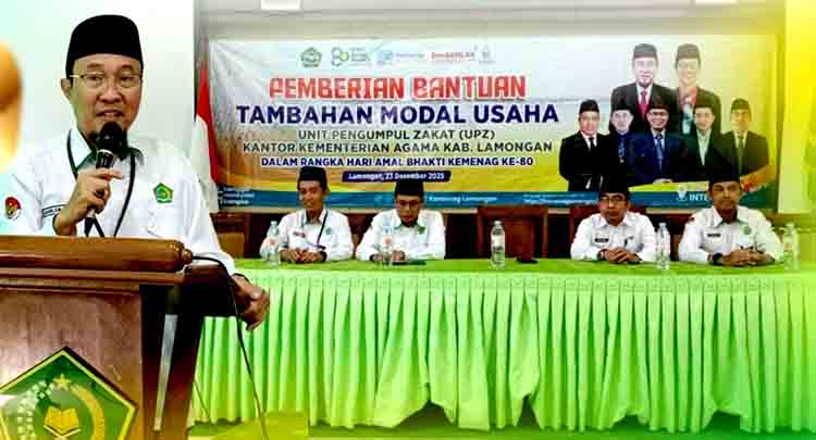 LAMONGAN | DN – Dalam rangka memperingati Hari Amal Bhakti (HAB) Kementerian Agama ke-80, Kantor Kementerian Agama Kabupaten Lamongan menyalurkan bantuan tambahan modal usaha bagi pelaku UMKM. Penyerahan bantuan dilakukan langsung oleh Kepala Kemenag Lamongan, H. Mohammad Muhlisin Mufa, di aula utama kantor Kemenag, Selasa (23/12/2025).