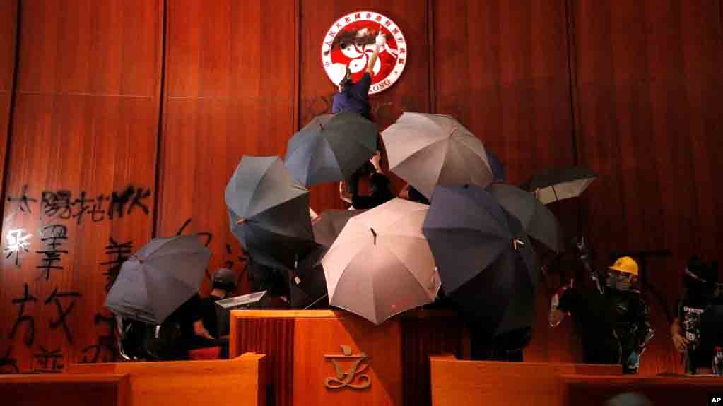 Ratusan pengunjuk rasa menerobos masuk ke gedung legislatif pada malam hari 1 Juli 2019, mereka memecahkan jendela dan men grafiti pada peringatan 22 tahun penyerahan Hong Kong dari Inggris ke China.