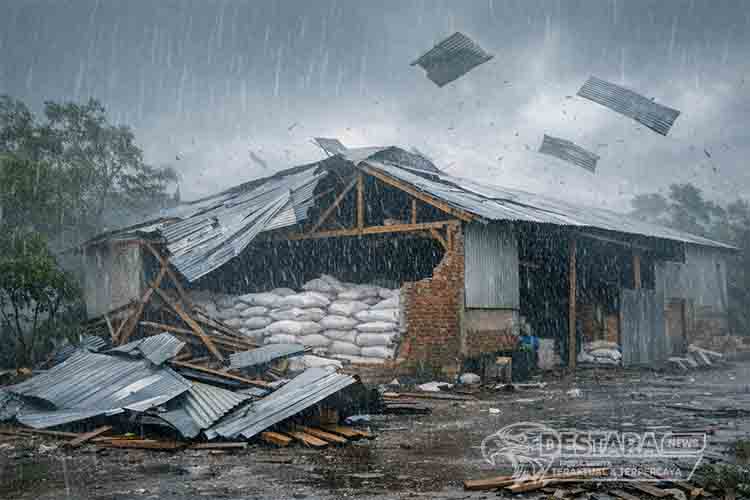 BOJONEGORO | DN – Cuaca ekstrem kembali melanda wilayah Kabupaten Bojonegoro. Hujan deras yang disertai angin kencang pada Jumat (10/4/2026) sore menyebabkan sebuah gudang pupuk organik di Desa Gayam, Kecamatan Gayam, mengalami kerusakan cukup parah.