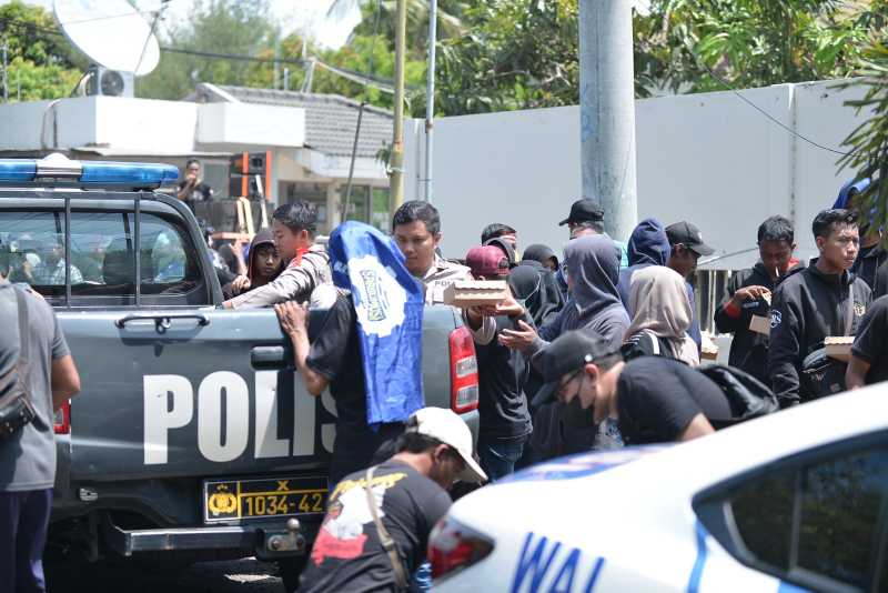Personel Polres Situbondo juga membagikan nasi kotak kepada ratusan karyawan yang menyampaikan aspirasinya di depan gerbang PT PMMP Situbondo, Rabu (23/10/2024).