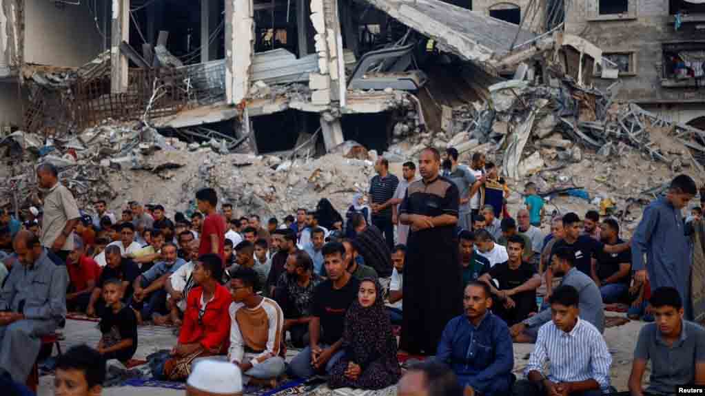 Mahmoud Abdel Jawad, salah seorang warga di sana, mengatakan, “Saat ini kita berada di sekitar Masjid Al-Amal. Sebagai muslim, kami mengikuti salat id. Seperti yang Anda tahu, bagi muslim, Iduladha adalah saatnya berkurban, tapi Iduladha kali ini tidak ada tanda-tanda perayaan. Tidak ada hewan kurban. Kini justru kami yang mengorbankan diri kami sendiri, kami mengorbankan tubuh kami sendiri. Tidak ada perayaan Iduladha di Gaza.”