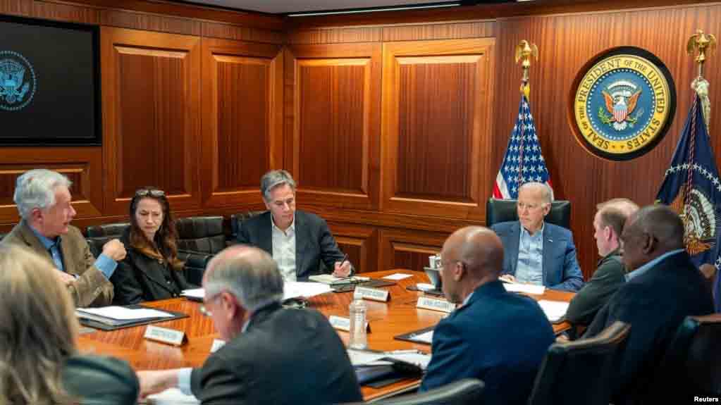 Presiden AS Joe Biden menggelar rapat dengan tim keamanan nasional di Gedung Putih, Washington, Sabtu, 13 April 2024. (Foto: Gedung Putih via Reuters)