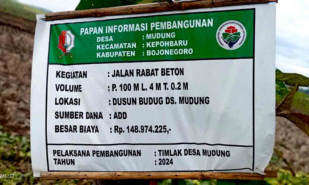 Salah satu proyek yang menggunakan Dana Desa Tahun 2024 adalah pembangunan Jalan Rabat Beton di Dusun Budug, Desa Mudung, Kecamatan Kepohbaru, Kabupaten Bojonegoro. Proyek ini dikerjakan oleh Tim Pelaksana Kegiatan (Timlak) Desa Mudung dengan anggaran sebesar Rp 148.974.225,- yang diharapkan menghasilkan jalan rabat dengan volume panjang 100 meter, lebar 4 meter, dan ketebalan 0,2 meter.