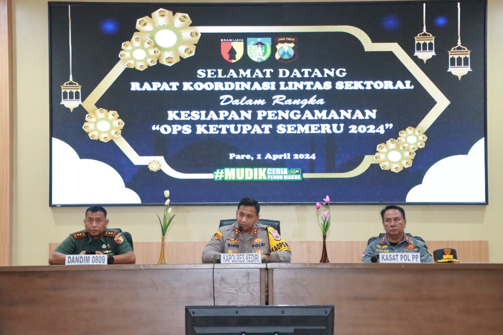 KEDIRI (DN) – Polres Kediri Polda Jatim menggelar Rapat Koordinasi (Rakor) lintas sektoral dalam rangka kesiapan pengamanan Ops Ketupat Semeru 2024, Senin (1/4/2024).