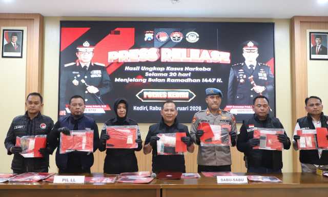 Hasil pengungkapan tersebut disampaikan Kapolres Kediri AKBP Bramastyo Priaji, S.H., S.I.K., M.Si. melalui Kasatresnarkoba Polres Kediri AKP Sujarno, S.H., M.H. dalam konferensi pers yang digelar di Aula Wicaksana Laghawa Mapolres Kediri, Rabu (18/2/2026).