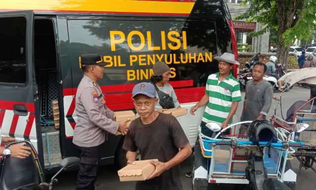 “Jadi sambil kita sampaikan himbauan kamtibmas, sekaligus berbagi nasi kotak kepada warga yang beraktifitas di jalan seperti abang becak, ojol dan juga petugas kebersihan,” ujar Kombes Pol Rama.