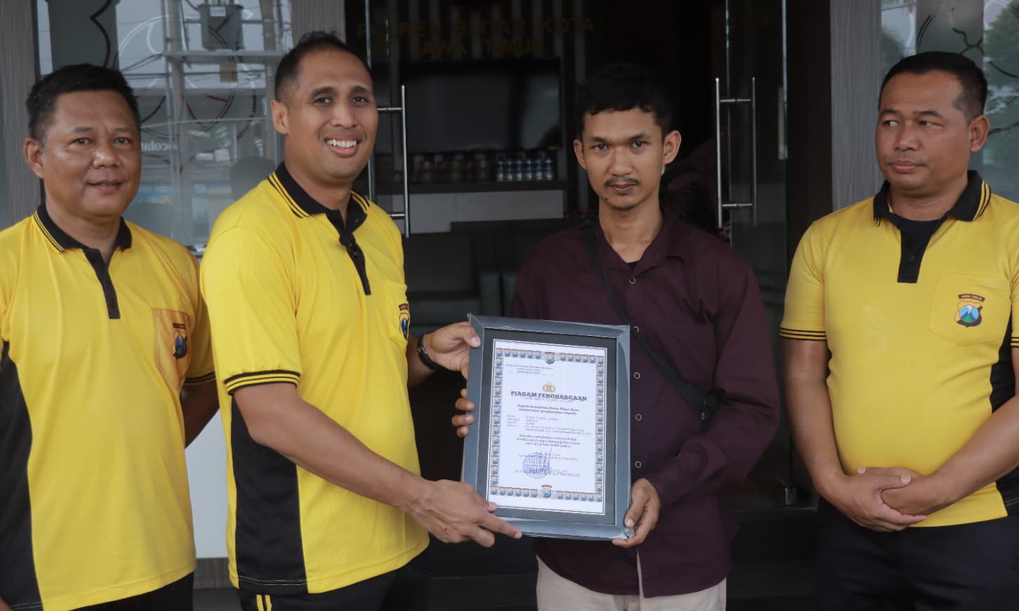 BLITAR | DN – Kapolres Blitar Kota, AKBP Titus Yudho Uly memberikan penghargaan kepada M Choirul Mizan (28), warga Kecamatan Garum, Kabupaten Blitar.