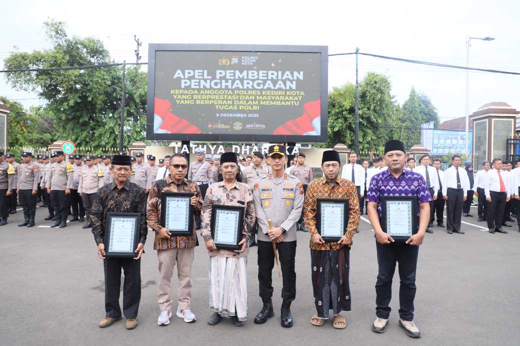 KEDIRI KOTA | DN – Kapolres Kediri Kota AKBP Anggi Saputra Ibrahim, S.H., S.I.K., M.H. memimpin apel pemberian penghargaan kepada sejumlah tokoh masyarakat yang dinilai berperan aktif mendukung tugas kepolisian di lapangan apel Mako Polres Kediri Kota, Selasa (9/12).