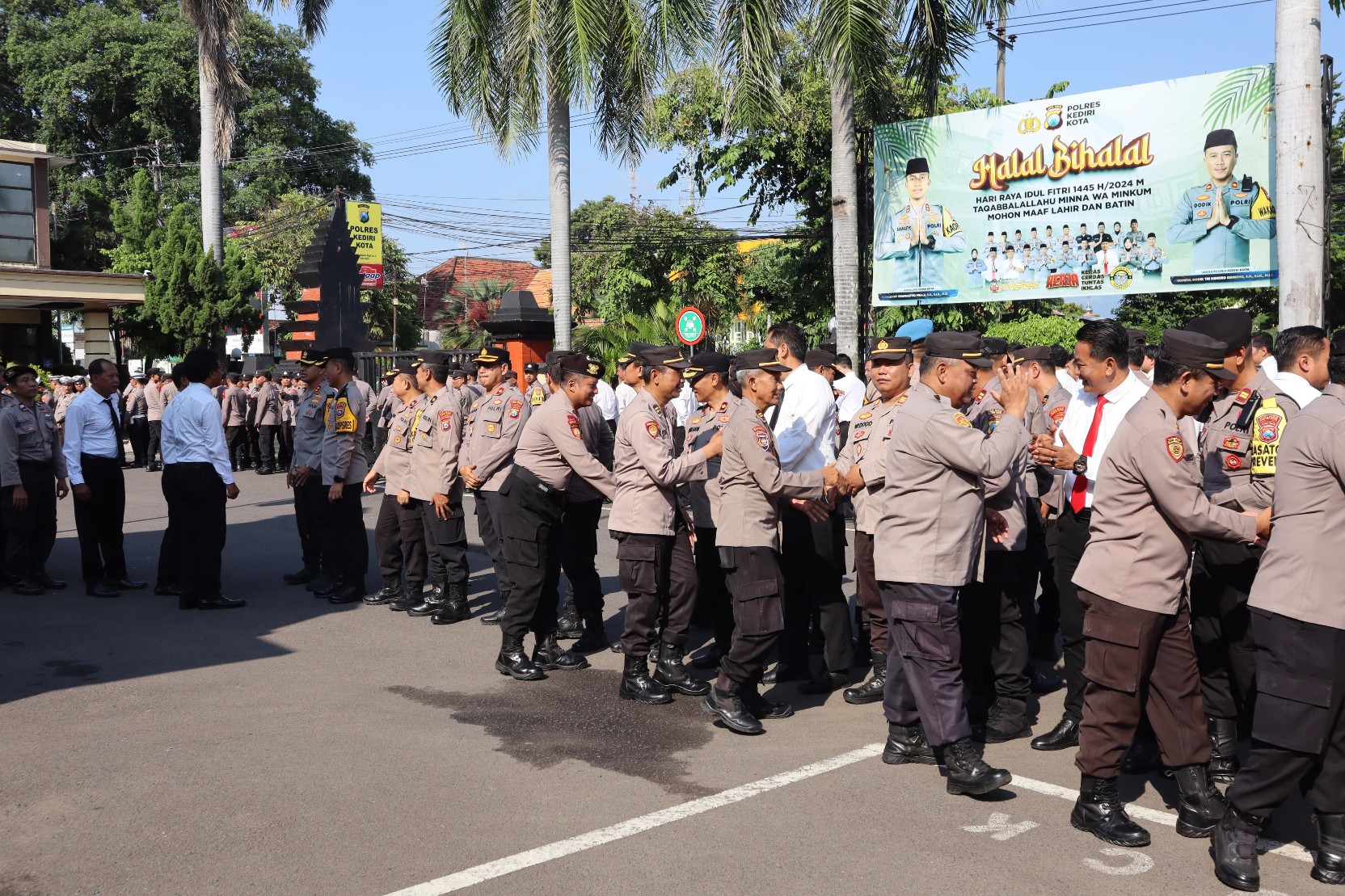 KEDIRI KOTA (DN) – Kapolres Kediri Kota AKBP Bramastyo Priaji, S.H, S.I.K, M.Si. menggelar kegiatan halal bihalal atau silaturahmi saling memberi maaf dengan Pejabat Utama (PJU) dan personel Polres Kediri Kota dan Polsek Jajaran, selesai pelaksanaan Apel pagi dihalaman mako Polres Kediri Kota, Senin (15/4/2024)