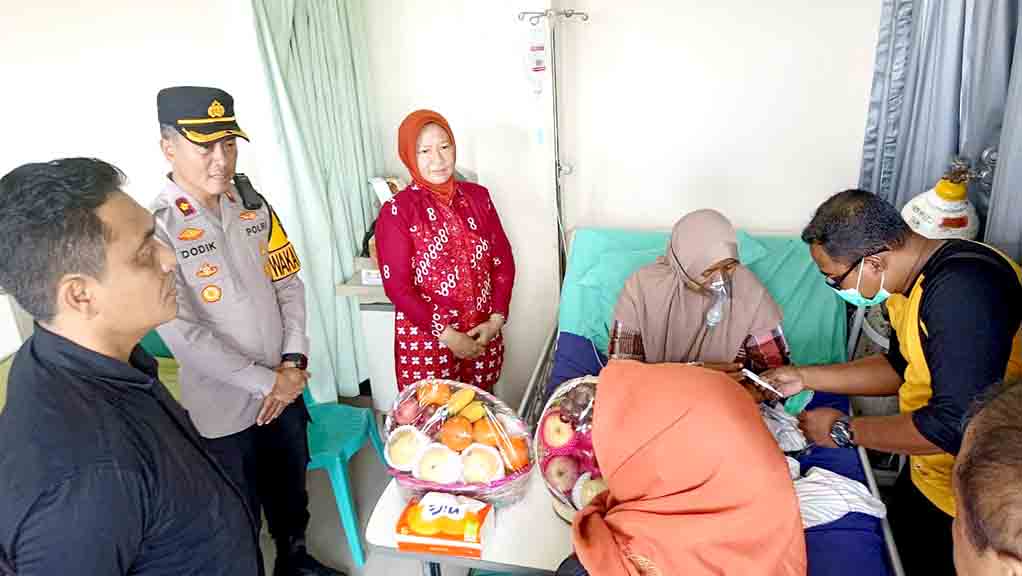 KEDIRI KOTA (DN) – Kapolres Kediri Kota AKBP Bramastyo Priaji, S.H., S.I.K., M.Si. diwakili Waka Polres Kediri Kota Kompol Dodik Tri Hendro Siswoyo, S.H., S.I.K., M.I.K., bersama Ketua KPU Kota Kediri Dra. Pusporini Indah Palupi menjenguk Ketua KPPS 11 Kel Tempurejo Kec Pesantren Kota Kediri yang sedang sakit dirawat di puskesmas Ngletih Kec Pesantren