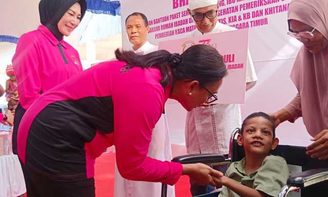 ENDE | DN – Ketua Umum Bhayangkari, Ny. Julianti Sigit Prabowo, melaksanakan rangkaian kegiatan Bhayangkari Peduli di Kabupaten Ende, Nusa Tenggara Timur, Rabu (1/10/2025). Kegiatan ini meliputi penyaluran bantuan sosial, bakti kesehatan, serta bakti religi yang dipusatkan di halaman Kantor Camat Ende Utara, Kelurahan Kota Raja, Kecamatan Ende Utara.