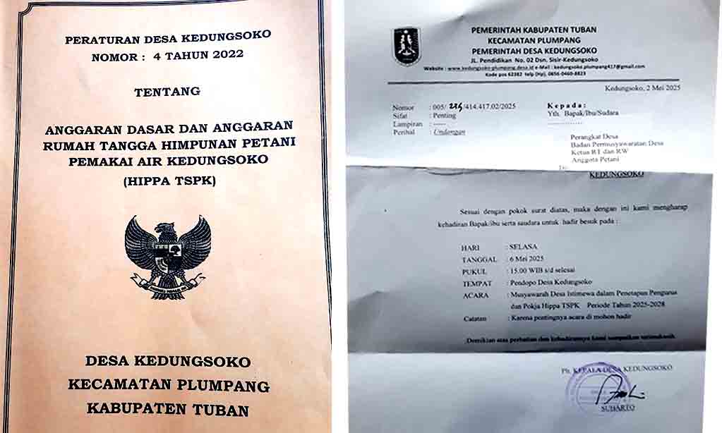 TUBAN | DN – Proses penetapan pengurus dan panitia kerja (Pokja) Himpunan Petani Pemakai Air (HIPPA) Tirto Sandang Pangan di Desa Kedungsuko, Kecamatan Plumpang, Kabupaten Tuban, menuai kritik dari warga. Sejumlah pelanggaran terhadap Anggaran Dasar dan Anggaran Rumah Tangga (AD/ART) organisasi diduga terjadi dalam mekanisme pembentukan panitia seleksi dan pemilihan pengurus baru.