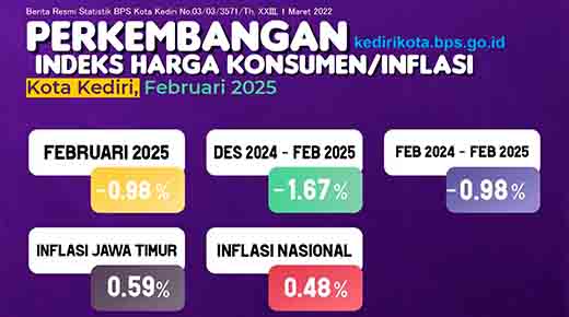 KEDIRI | DN – Menjelang bulan suci Ramadan, Kota Kediri mencatatkan Indeks Harga Konsumen (IHK) dengan angka deflasi tertinggi di Jawa Timur pada Februari 2025. Hal ini disampaikan oleh Emil Wahyudiono, Kepala Badan Pusat Statistik (BPS) Kota Kediri, melalui sambungan telepon pada Jumat (14/3). Emil menjelaskan bahwa Kota Kediri mengalami deflasi bulanan (month-to-month/m-to-m) sebesar -0,98 persen dan tahunan (year-on-year/y-on-y) sebesar -0,98 persen.