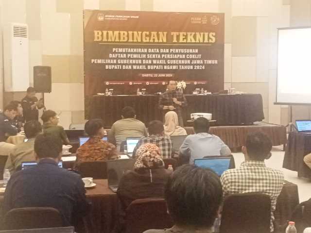 NGAWI | DN  – Komisi Pemilihan Umum Kabupaten Ngawi telah mengadakan Bimbingan Teknis (Bimtek) pemutakhiran data dan penyusunan daftar pemilih, serta persiapan pencocokan dan penelitian (coklit) pemilihan Gubernur dan Wakil Gubernur Jawa Timur, Bupati dan wakil Bupati Ngawi tahun 2024, bertampat di Kurnia Hall, Sabtu (22/06/2024).