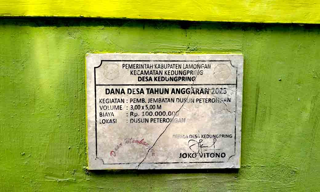 LAMONGAN | MDN – Dana Desa (DD) yang dikucurkan dari Anggaran Pendapatan Belanja Negara (APBN) bertujuan untuk mewujudkan pembangunan dan pemberdayaan menuju masyarakat desa yang adil, makmur, dan sejahtera. Salah satu implementasinya adalah pembangunan jembatan di Dusun Peterongan, Desa Kedungpring, Kecamatan Kedungpring, Kabupaten Lamongan.