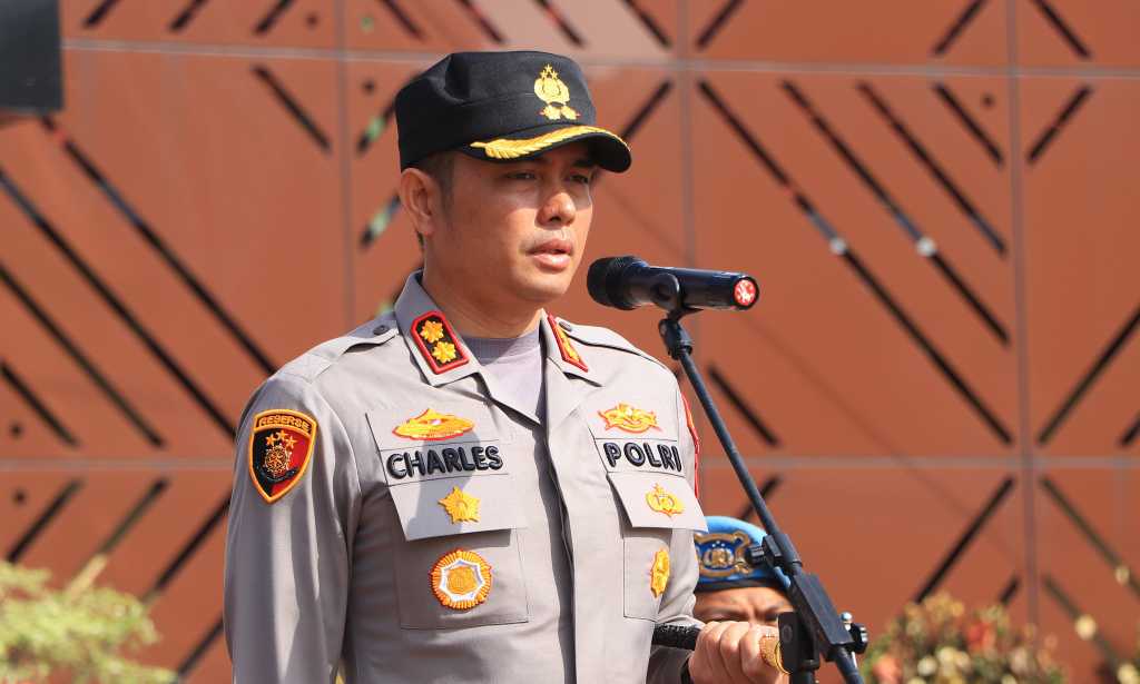 Kapolres Ngawi AKBP Charles Pandapotan Tampubolon, S.I.K., S.H., M.H., menghimbau masyarakat dan seluruh penonton serta suporter Liga 4 Indonesia, khususnya yang hadir di Stadion Ketonggo Kab. Ngawi untuk tetap tertib dan menjaga keamanan.