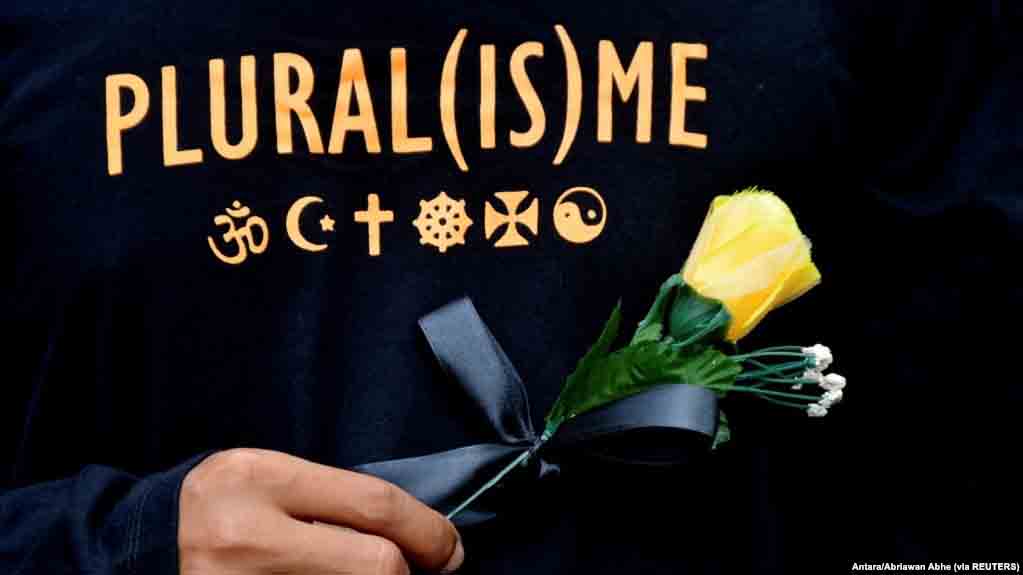 Seseorang memegang bunga di Gereja Katedral saat perayaan Paskah di Makassar, Sulawesi Selatan, 4 April 2021. (Foto: Antara/Abriawan Abhe via Reuters).