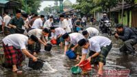Santri Lamongan Gelar Aksi Unik, Kuras Banjir Jalan Raya dengan Peralatan Seadanya