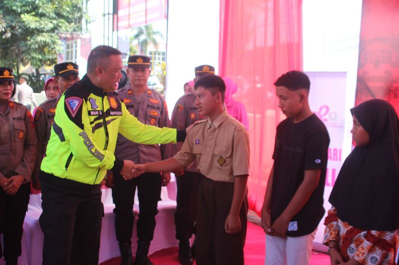 Sesampainya di Polsek Kalangbret Polres Tulungagung, Kapolda Jatim memberikan bantuan sosial kepada anak Yatim dan Lansia warga Kabupaten Tulungagung.