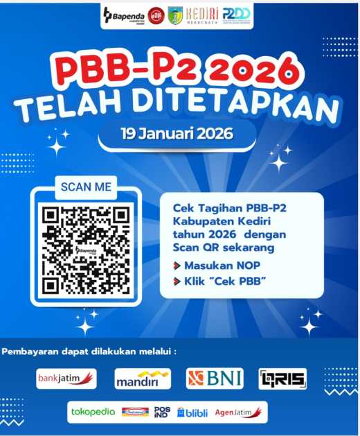 KEDIRI | DN — Pemerintah Kabupaten Kediri melalui Bapenda Kabupaten Kediri resmi menetapkan Pajak Bumi dan Bangunan Perdesaan dan Perkotaan (PBB-P2) tahun 2026 pada 19 Januari 2026. Penetapan ini menjadi dasar bagi masyarakat untuk segera mengetahui besaran pajak yang harus dibayarkan.