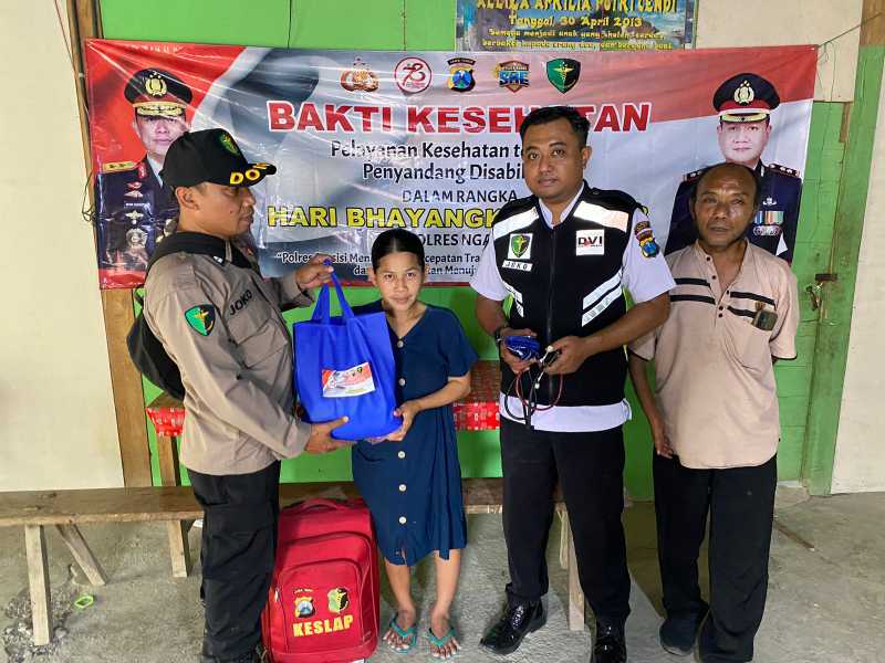 Tim Sidokkes Polres Ngawi melaksanakan pemeriksaan kesehatan door to door, yang meliputi pemeriksaan tensi darah dan pemberian vitamin. Selain itu, tim juga memberikan bantuan sosial (bansos) kepada sepuluh orang penyandang disabilitas di wilayah tersebut.