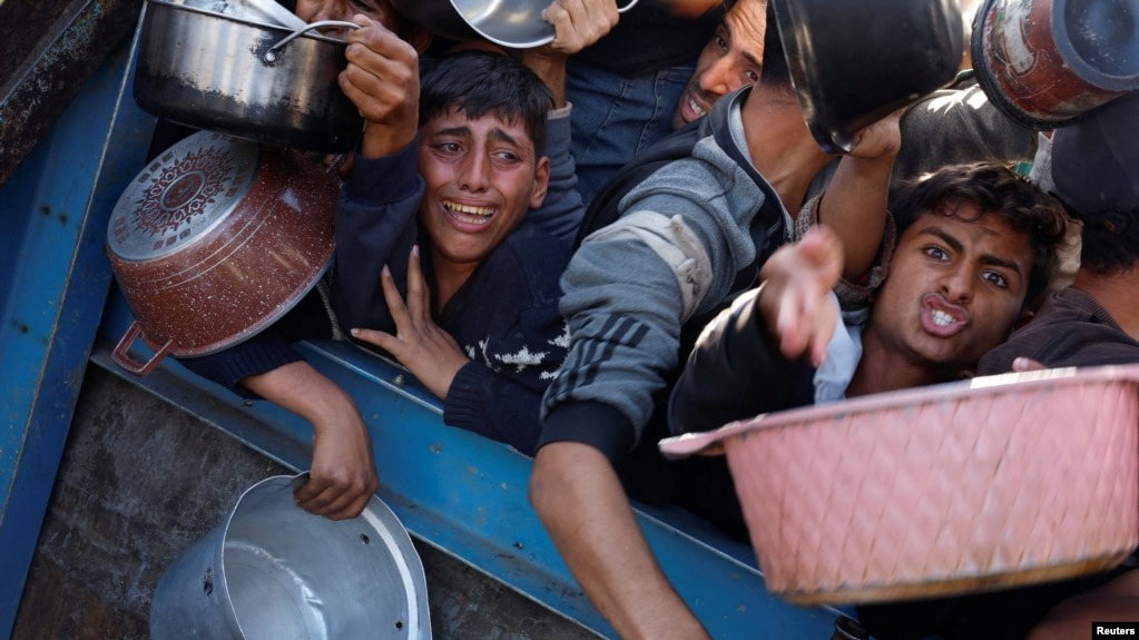 Sejumlah warga Palestina berdesak-desakan saat mengantre untuk mendapatkan makanan di sebuah dapur umum di Khan Younis, Jalur Gaza, pada 4 Desember 2024. (Foto: Reuters/Mohammed Salem)