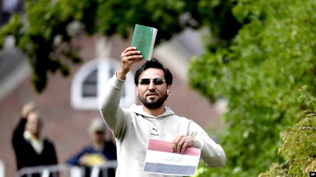 Salwan Momika di luar Kedutaan Besar Irak di Stockholm, Swedia di mana dia berencana akan membakar Al-Qur'an dan bendera Irak, 20 Juli 2023. Momika tewas ditembak pada Rabu, 29 Januari 2025. (Foto: Oscar Olsson/TT via AP)