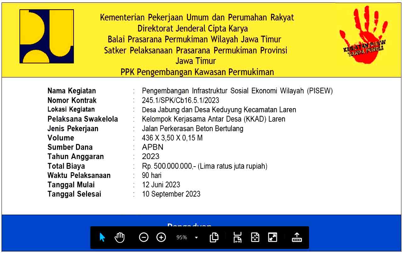 Salah satunya yang mendapat program PISEW adalah Desa Keduyung dan Desa Jabung, Kecamatan Laren, Kabupaten Lamongan, Jawa Timur. Sedangkan titik lokasi kegiatan berada di Jalan Poros antar kedua desa tersebut, dengan anggaran Rp. 500.000.000,-.