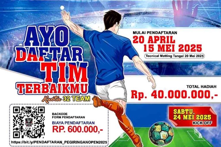 PEMALANG | DN – Kesempatan emas bagi tim-tim sepak bola untuk berlaga di turnamen bergengsi PEGIRINGAN OPEN 2025 kini telah tiba. Pendaftaran resmi dibuka mulai tanggal 20 April 2025 hingga mencapai kuota maksimal 32 tim. Untuk sesi Technical Meeting, dijadwalkan akan berlangsung pada 20 Mei 2025.
