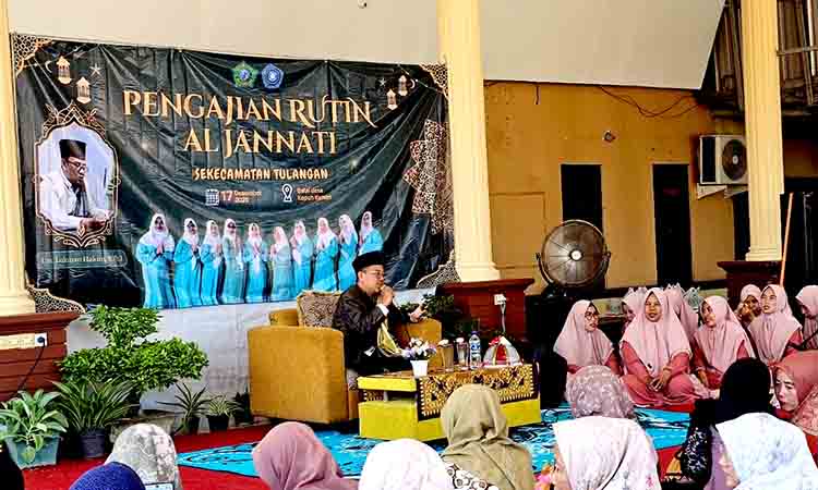 SIDOARJO | DN – Balai Desa Kepuh Kemiri, Kecamatan Tulangan, Kabupaten Sidoarjo, dipenuhi suasana religius saat ratusan kader Tim Penggerak PKK dari seluruh desa di Kecamatan Tulangan menghadiri Pengajian Al‑Jannati, Rabu (17/12/2025). Para peserta hadir dengan busana muslimah seragam, menciptakan nuansa kebersamaan yang hangat dan penuh kekhidmatan.