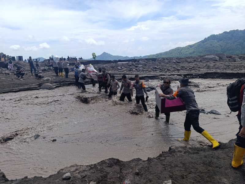 LUMAJANG | DN – Personel gabungan dari Brimob Polda Jawa Timur, Polres Lumajang, serta Polsek jajaran melaksanakan kegiatan kemanusiaan pascabencana luapan lahar Gunung Semeru di Dusun Sumberlangsep, Desa Jugosari, Kecamatan Candipuro, Kabupaten Lumajang, Senin (8/12/2025).