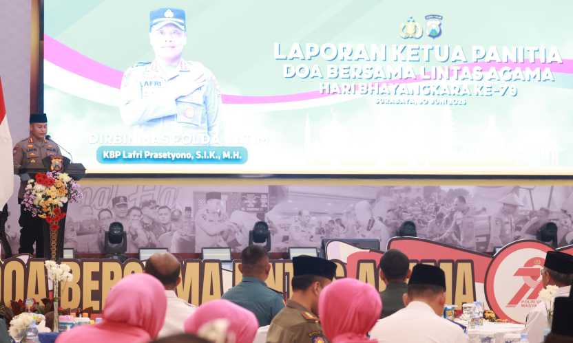 SURABAYA | DN – Kepolisian Daerah Jawa Timur menggelar doa bersama lintas Agama dalam rangka menyambut Hari Bhayangkara Ke-79 tahun 2025 di Gedung Mahameru Polda Jatim,Senin (30/6/2025).