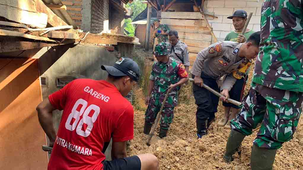 Puluhan personel yang merupakan anggota dari Koramil dan Polsek Bendungan Polres Trenggalek ini dikerahkan untuk membantu evakuasi dan membersihkan material tanah dan batu yang memenuhi dapur rumah warga bernama Sukar.