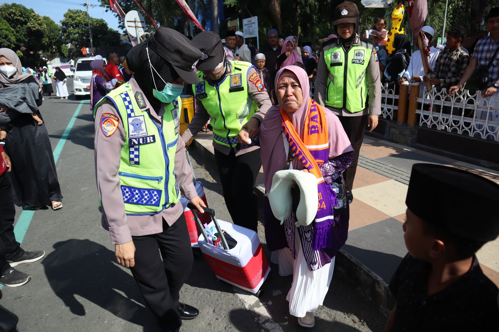 Terlihat humanis Polisi yang melakukan pengamanan ikut membantu menuntun jamaah lansia menuju bus dan beberapa Polisi lainnya turut membantu membawakan koper para calon jamaah haji.