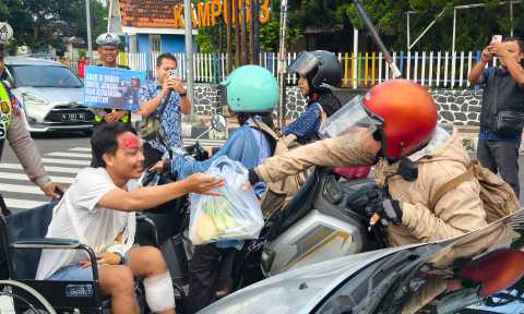 Dalam kegiatan tersebut, petugas membawa replika pocong serta menghadirkan peraga korban kecelakaan lalu lintas penyandang disabilitas untuk menarik perhatian pengguna jalan.
