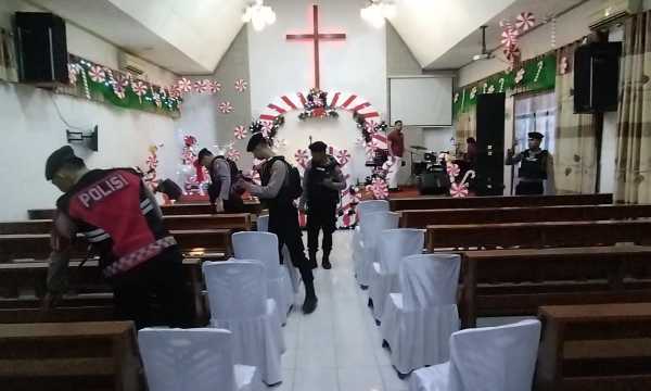 BOJONEGORO | DN – Personel Polres Bojonegoro Polda Jatim melaksanakan sterilisasi gereja guna memastikan keamanan dan kenyamanan umat Kristiani menjelang pelaksanaan ibadah.