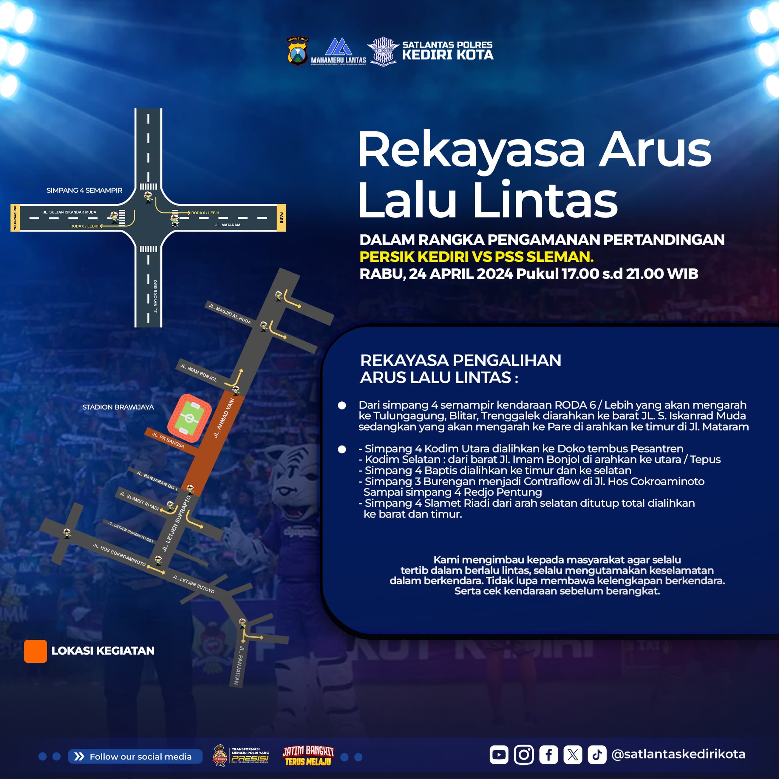 KEDIRI KOTA (DN) – Polisi akan melakukan rekayasa arus lalu lintas di Kota Kediri. Hal itu dikarenakan adanya laga lanjutan BRI Liga 1 pekan ke-33 antara Persik Kediri melawan PSS Sleman di Stadion Brawijaya Kota Kediri, Rabu (24/4/2024) pukul 19.00 WIB.