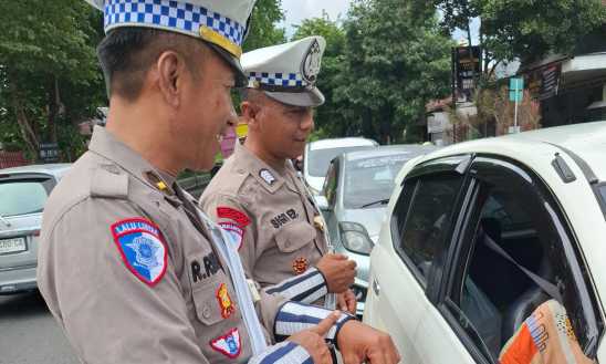 Kanit Kamsel Satlantas Polres Kediri Kota Ipda R Rido bersama anggota turun langsung ke lapangan untuk memberikan imbauan kepada para pengendara.