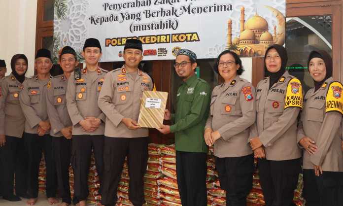 Penyaluran zakat fitrah secara simbolis diserahkan oleh Kapolres Kediri Kota AKBP Bramastyo Priaji, S.H., S.I.K., M.Si. di serambi Masjid Baiturahim Polres Kediri Kota, Minggu (30/3/2025)